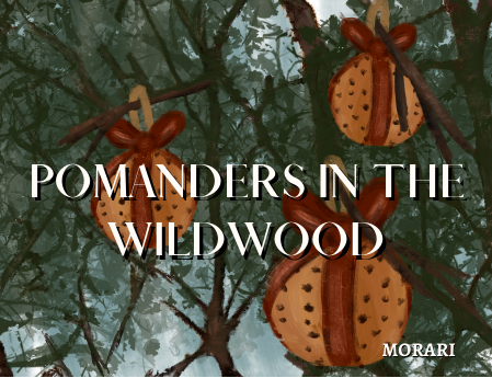 Scent Description: For this scent, I’m imagining pomanders (clove-studded oranges) hanging from gnarled branches in the wildwood. Deeper within the brambles lies a crone’s cottage – perhaps the crone hung the pomanders? A bitter winter wind is blowing through the wildwood, causing the pomanders to swing precariously from the tree branches.